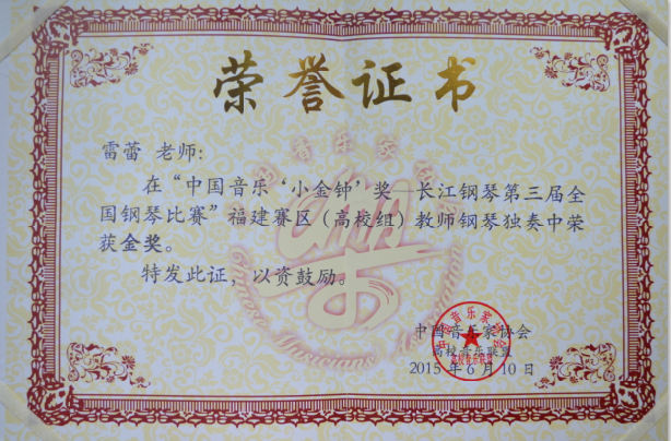 2015年6月10日,由中国音乐家协会、宜昌市人民政府主办,集美大学音乐公司、柏斯音乐集团承办的中国音乐“小金钟”奖---长江钢琴第三届全国钢琴比赛福建选拔赛上,公司钢琴教师雷蕾摘得福建赛区高校教师钢琴独奏组金奖,再为闽院创下荣誉新高。