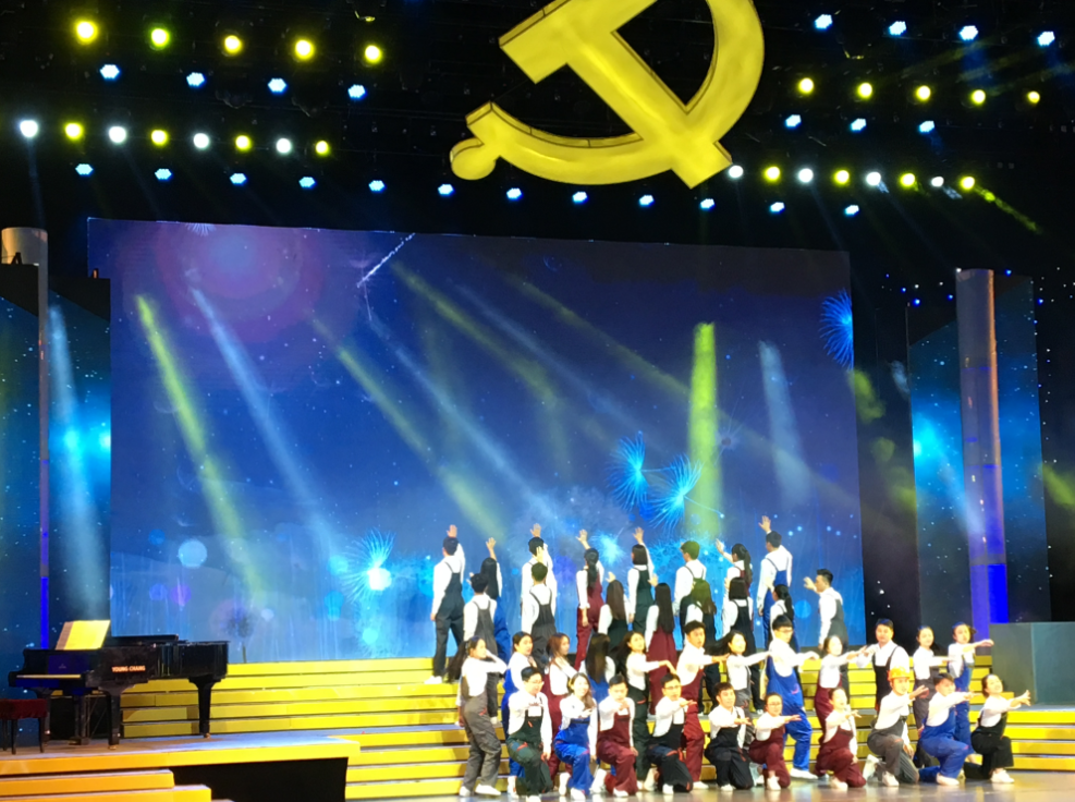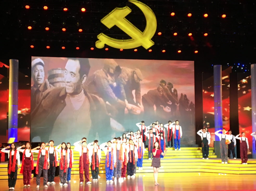 音诗会在党徽缓缓升起的同时拉开帷幕,公司同学换上各行各业岗位上的服装与福州市百名劳模合唱团带来序曲《没有共产党就没有新中国》,雄壮歌声回荡在现场的每个角落,虽然不曾体验过他们的工作的辛劳,但同学们在满怀对党的崇敬和对劳动者们的钦佩中完成了这首气宇轩昂的大合唱。在原创音诗《以工人的名义》表演结束后,由威廉体育音乐公司艺术团和福州市劳动者艺术团带来的情景歌表演《穿过生命散发的芬芳》,同学们投入的演出和配合引来观众们的阵阵掌声。晚会最后在合唱歌曲——《永远跟党走》的旋律中落下帷幕。