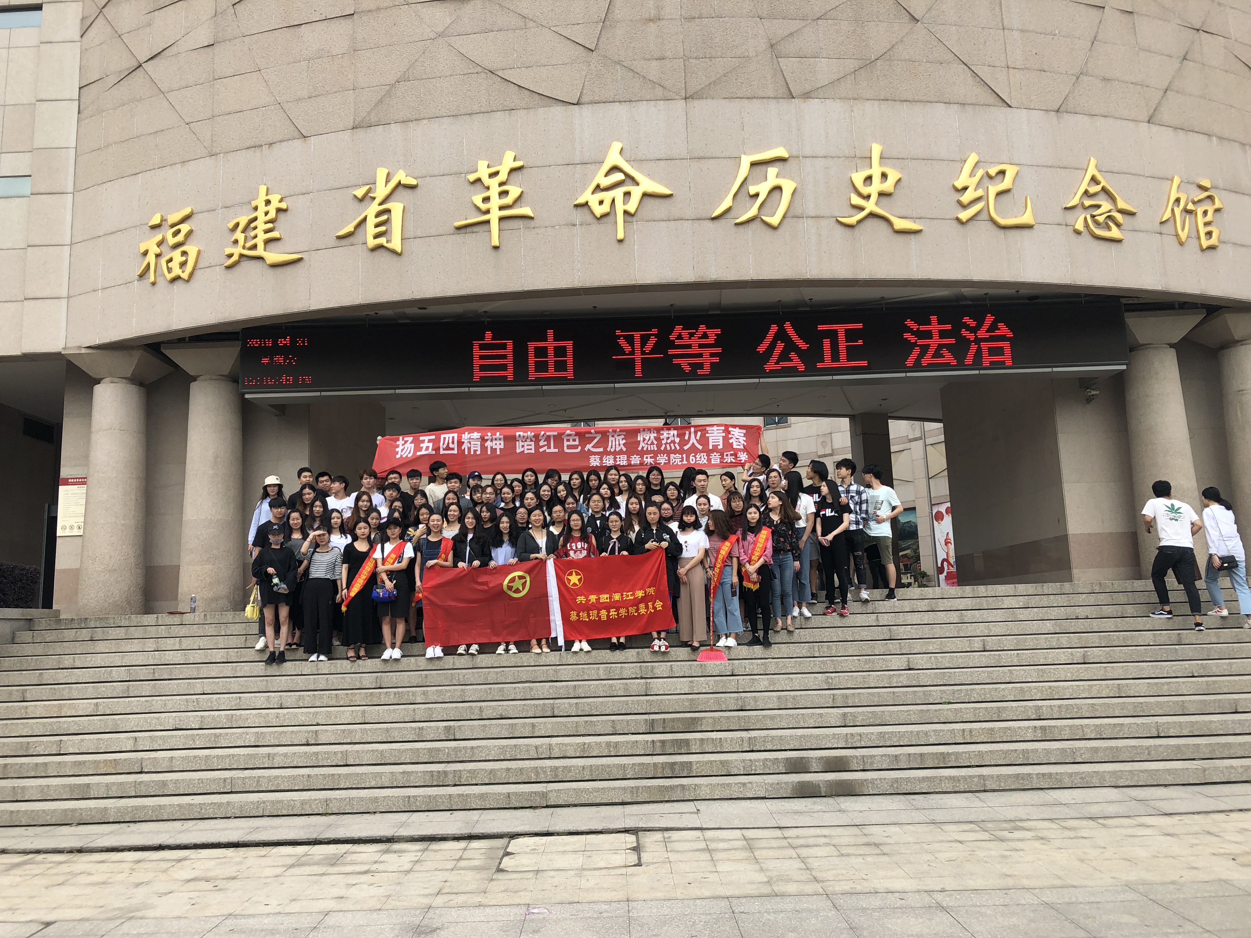 同学们到达福州革命历史纪念馆后,首先参观了革命历史纪念馆革命先烈的光荣事迹,通过过先辈们事迹的了解,表达了对革命先烈的缅怀,参观结束后,同学们还在纪念馆门前朗诵五四诗歌,并向革命先烈宣誓成为一名有理想、有道德、有文化、热爱祖国、服务他人的新时代青年。参观活动在高昂的共青团团歌声中结束。