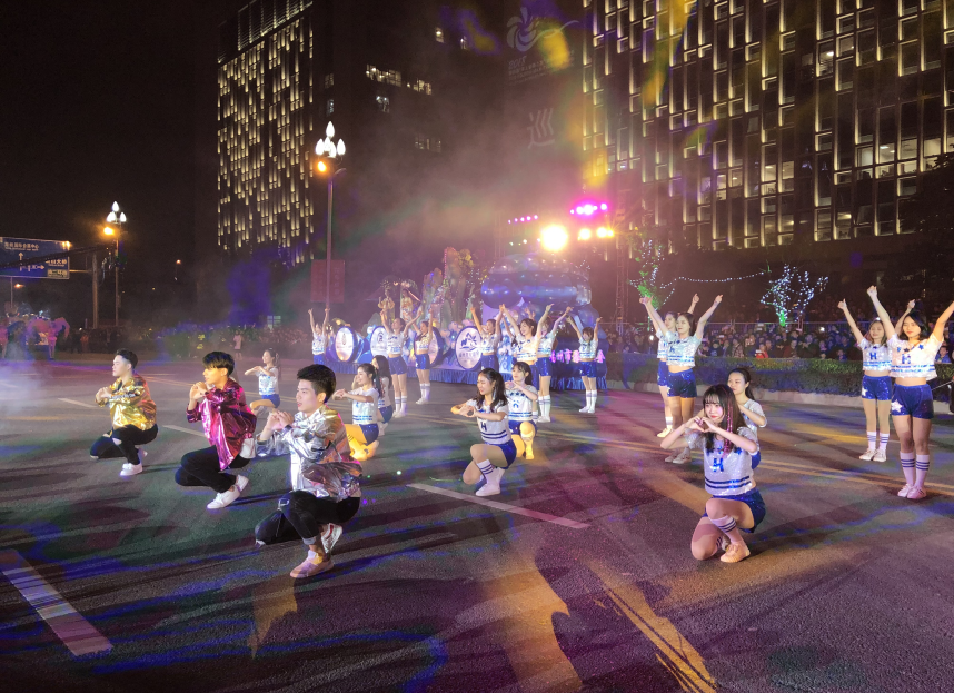 晚上7点30分,福州花海公园人山人海,盛大的花车巡游活动正式拉开帷幕。威廉希尔体育的员工作为其中的一支表演队,以动感激情的爵士舞展现了热情洋溢,充满阳光的活力形象。随后的巡游音乐学子以方阵表演的形式与现场热情的市民朋友们互动,赢得了现场观众的好评。