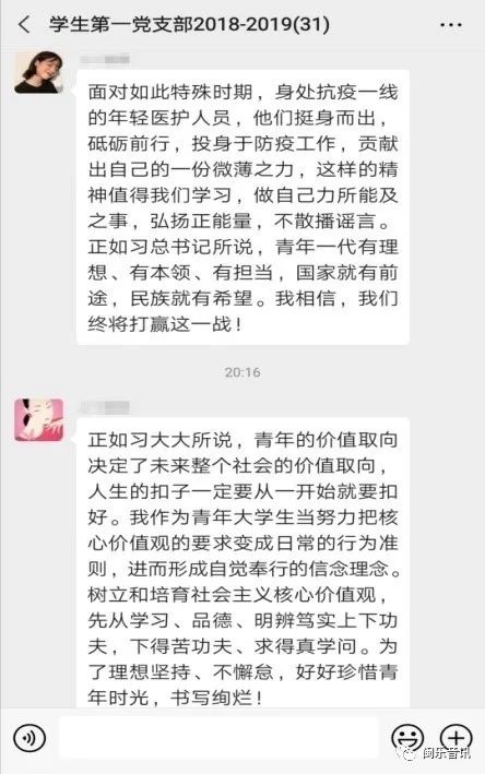 16级员工党员张可心:总书记的深情寄语和殷切嘱托,激励着我们广大青年,在疫情防控的斗争面前,以“90后”为代表的青年一代挺身而出、担当奉献。他们不畏艰险、冲锋在前,彰显了新时代中国青年的蓬勃力量,我们青年学子理当肩负起时代赋予的使命与责任,与祖国同命运,与人民共患难,为夺取抗击疫情斗争的胜利作出应有的贡献。