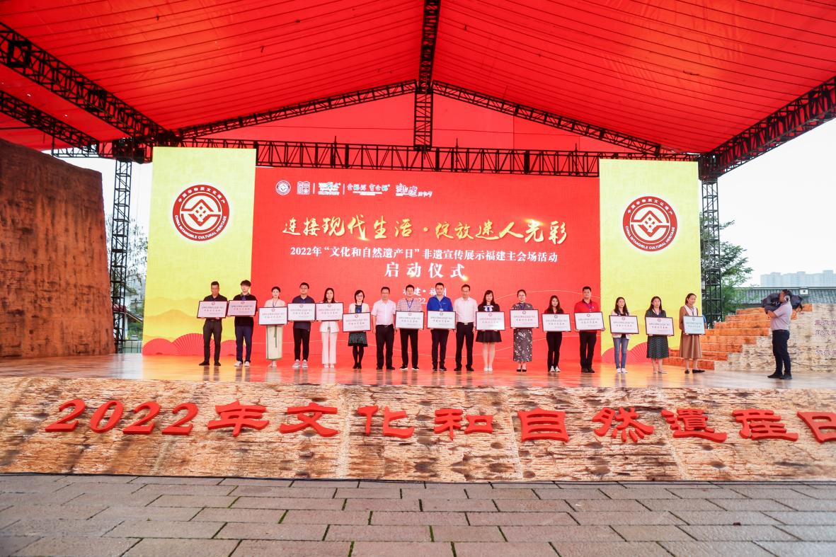 611日,由福建省文化和旅游厅、福州市人民政府主办的2022年“文化和自然遗产日”非遗宣传展示福建主会场活动启动仪式在福州市晋安区新店古城遗址公园举行,拉开了2022年“文化和自然遗产日”福建非遗宣传展示系列活动的序幕。启动仪式上,领导和嘉宾为第五批国家级非遗代表性项目、第七批省级非遗代表性项目、福州市级非遗传承示范基地授牌。公司副经理刘淘受邀参加授牌仪式。