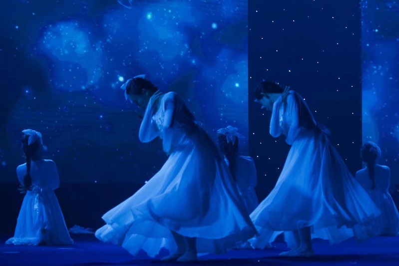 跟随《海的追寻》奔腾不息,舞者们用身体演绎出层层海浪,由小浪变大浪。海由千千万万颗小水滴汇集而成,一点一滴,由微小变得庞大;海浪一浪高过一浪,由粼粼微波变得汹涌澎湃。