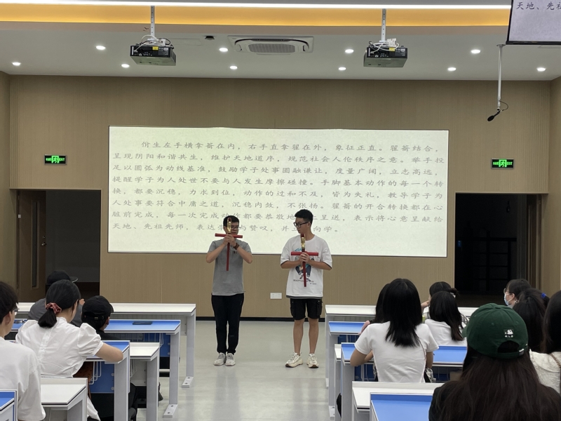 讲座中,李先生拿出佾舞的道具并请佾生做示范,邀请两位同学上台学习。“左手横拿籥,右手直拿翟”, 佾舞的每个献礼有32个动作,举手投足以圆弧为动线基准,鼓励学子处事圆融,立志高远;其左右对称的方阵队形,象征为人中正平和、胸襟广阔。李先生说,佾舞要求舞者用内观、自省的仪态呈现给大众,这才是真正我们中国真善美的舞蹈。