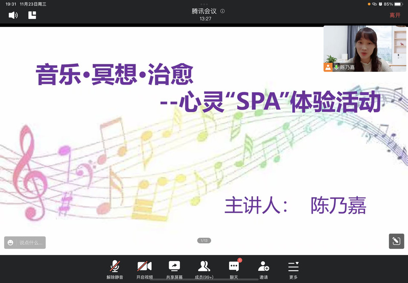 为进一步做好疫情防控下的心理战“疫”,强化员工应对疫情的心理应对能力,提升心理素质水平,11月23日,音乐公司音乐治疗辅导员工作室开展了“音乐•冥想•治愈——心灵‘SPA’”线上心理体验活动。活动邀请到了公司副教授、声乐教研室主任陈乃嘉博士作为主讲人。活动以二课活动的形式面向全校近300名同学开展,旨在引导同学们学会通过音乐冥想找回内心的宁静、快乐,学会保持豁达的心态,发现感知身边的美好。