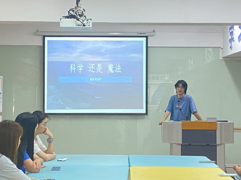 本场活动中,沈思锐同学以“科学还是魔法?——音乐与治疗”为主题,将活动分为“音乐”和“治疗”两个主要部分。在“音乐”部分中,沈思锐通过发问“你觉得音乐应该是怎样的?”,引起同学们对音乐的思考;随后介绍了人们在日常生活中听到不同音乐时会产生的情绪变化,让同学们了解到了音乐对情绪的直接影响,体会了音乐在改善人类情绪方面的优势,初步认识了日常生活中音乐的重要用途。