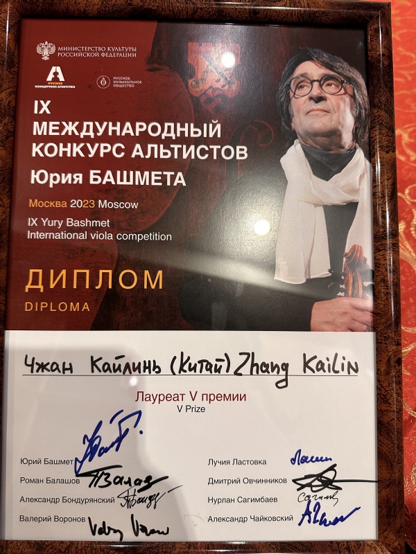 近日,由俄罗斯文化部主办的第九届尤里·巴什梅特国际中提琴比赛落下帷幕。音乐公司青年教师张铠麟突破重围,作为唯一进入决赛的中国选手,在决赛中演奏莫扎特《降E大调交响协奏曲k364》和《沃尔顿协奏曲》,荣获第五名的好成绩。