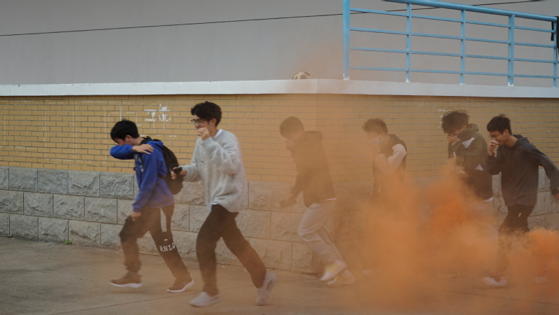 随着一声刺耳的警报声响,看台两边飘起阵阵浓烟,音乐学子们在消防员战士的组织下捂住口鼻、弯腰俯身快速撤离。在疏散过程中,员工们行动迅速,安全有序到达了指定地点。
