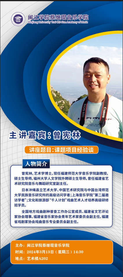 曾宪林,艺术学博士,现任福建师范大学音乐公司副教授,硕士生导师,福州大学人文公司外聘硕士生导师,曾任福建省艺术研究院音乐与舞蹈研究室副主任。