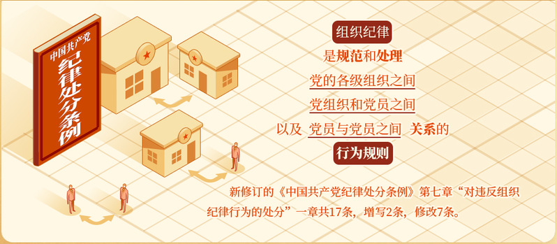 新修订的《中国共产党纪律处分条例》第七章“对违反组织纪律行为的处分”共17条,增写2条,修改7条。新增第八十条,对在党组织纪律审查中,依法依规负有作证义务的党员拒绝作证或者故意提供虚假情况,达到情节较重或者情节严重程度的,给予警告、严重警告直至开除党籍的处分;新增第八十五条,明确规定在推进领导干部能上能下工作中搞好人主义,存在以党纪政务等处分规避组织调整、以组织调整代替党纪政务等处分或者其他避重就轻作出处理行为的,视情节给予相应处分。在第八十六条增写对在授予学术称号中弄虚作假、违规谋利行为的处分规定,促进营造识才爱才敬才用才的良好氛围,为推动创新人才评价机制提供纪律保障;在第九十一条对党员虽经批准因私出国(境)但存在超出批准范围的行为作出处分规定;等等。