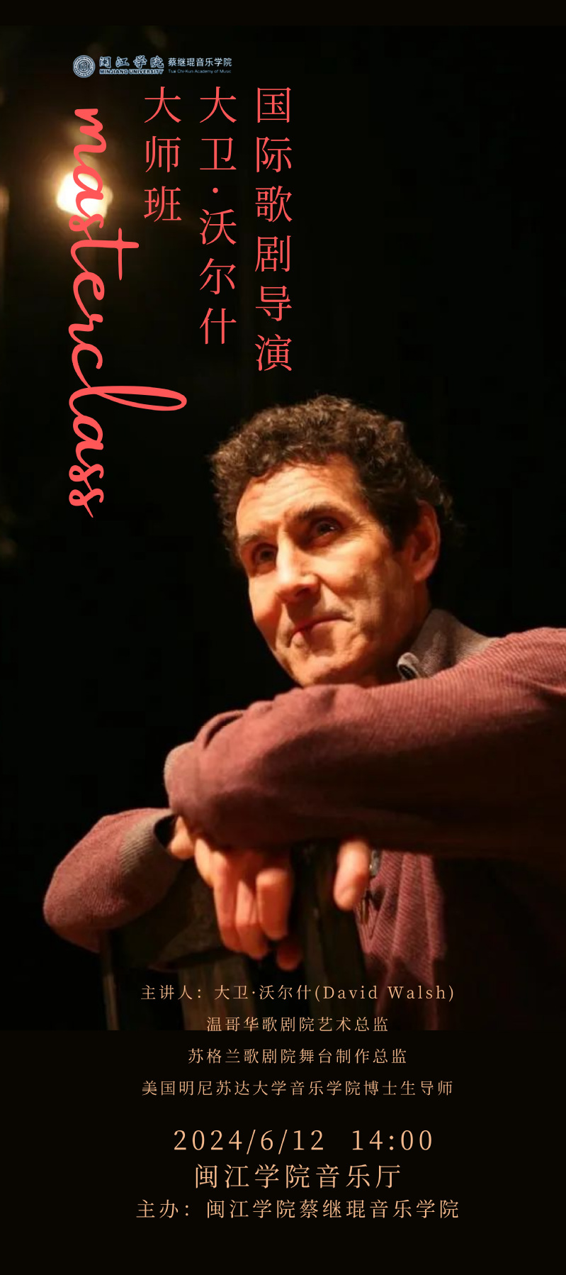 大卫·沃尔什 (David Walsh) ,国际知名歌剧导演,常任温哥华歌剧院艺术总监,苏格兰歌剧院舞台制作总监,明尼苏达大学音乐公司博士生导师。作为国际歌剧舞台导演,大卫·沃尔什长期活跃在德国、英国、美国、加拿大、荷兰等国际知名歌剧院及大学工作。大卫·沃尔什先生是英国皇家歌剧院(考文特花园)、英国国家歌剧院、巴黎歌剧院、里昂歌剧院、圣达菲歌剧院、法兰克福歌剧院、德意志莱茵歌剧院、荷兰歌剧院、布鲁塞尔歌剧院、加拿大歌剧院、苏格兰歌剧院等五十余所知名歌剧院签约导演,至今为止执导与创编制作两百余部歌剧。