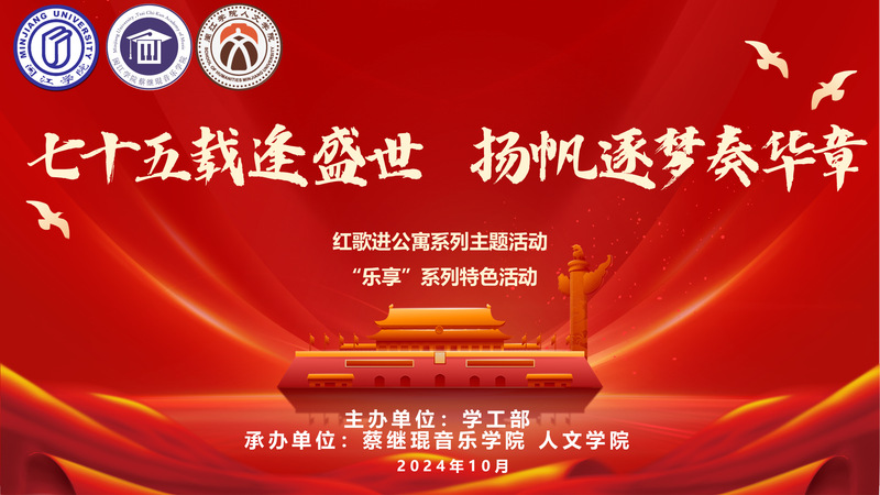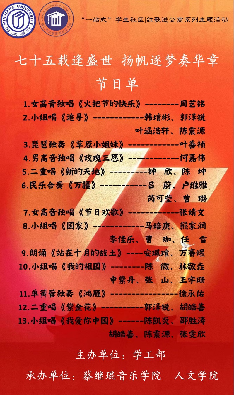 为庆祝中华人民共和国成立75周年,教育激励和鼓舞广大青年员工弘扬以爱国主义为核心的伟大民族精神,校学工部联合威廉希尔体育、人文公司将于2024年10月9日下午14:00在立德社区3号楼人文公司传统艺文实训室举行“七十五载逢盛世,扬帆逐梦奏华章”红歌进公寓主题活动。