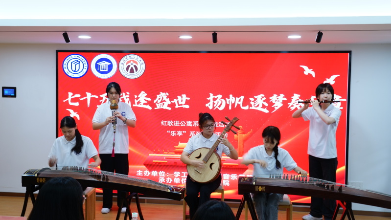如果历史有声音,那它一定是红歌的旋律,激荡着每一个中华儿女的心房。从南湖红船的轻轻摇曳,到天安门城楼的庄严宣告,每一首歌都承载着一段故事,每一段旋律都记录着一种精神。音乐学子满怀热情,以歌声为媒,通过独唱、小组唱、民乐合奏、朗诵等多种形式演绎《新的天地》、《我的祖国》、《我爱你中国》等经典红歌作品,带来了一场别开生面的红歌进公寓活动。歌声悠扬动听,旋律激昂澎湃,仿佛穿越时空的隧道,将我们带回到那个烽火连天的年代,感受着革命先烈的英勇与智慧。
