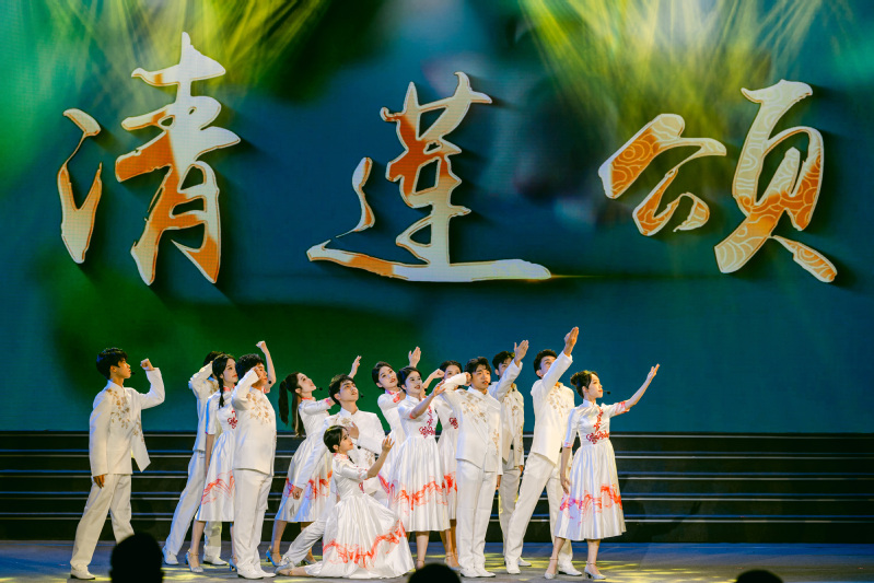 晚会中,公司青年学子以音乐情景剧的方式将原创歌曲《清莲颂》完美展现在舞台,优美的旋律、艺术化的舞台表达,获得了现场观众热烈的掌声。歌曲《清莲颂》由公司陆徽副经理作曲并编曲,以“莲”为意象,讴歌了共产党人“出淤泥而不染、亭亭玉立碧波之间”的纯洁正直形象,“淡淡清香不争艳、心如明月映青天”的高贵品格,“不图富贵讲奉献、初心不忘立于天地间”的高尚情怀。