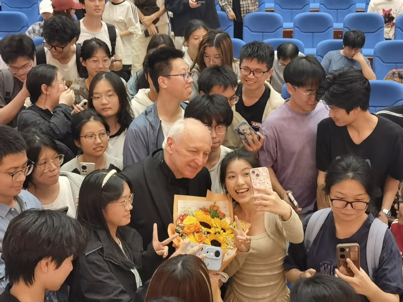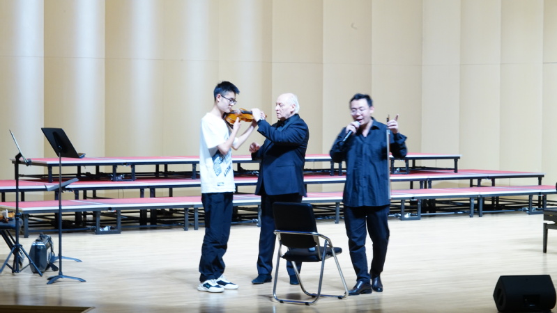 瓦列里·瓦罗纳教授现场分享了他演奏小提琴的经验,从练琴的习惯、方法等方面进行了详细的介绍。音乐会尾声的互动环节,瓦列里·瓦罗纳教授邀请了一位从未接触过小提琴的观众上台体验,手把手的指导让该同学十分兴奋与感动。演出结束后,现场观众纷纷与瓦列里·瓦罗纳教授合影,有观众表示,“很荣幸有机会现场聆听俄罗斯功勋艺术家的演出,在欣赏过程中曾有流泪的感觉,我想应该是美妙的琴声触动了自己的内心”。