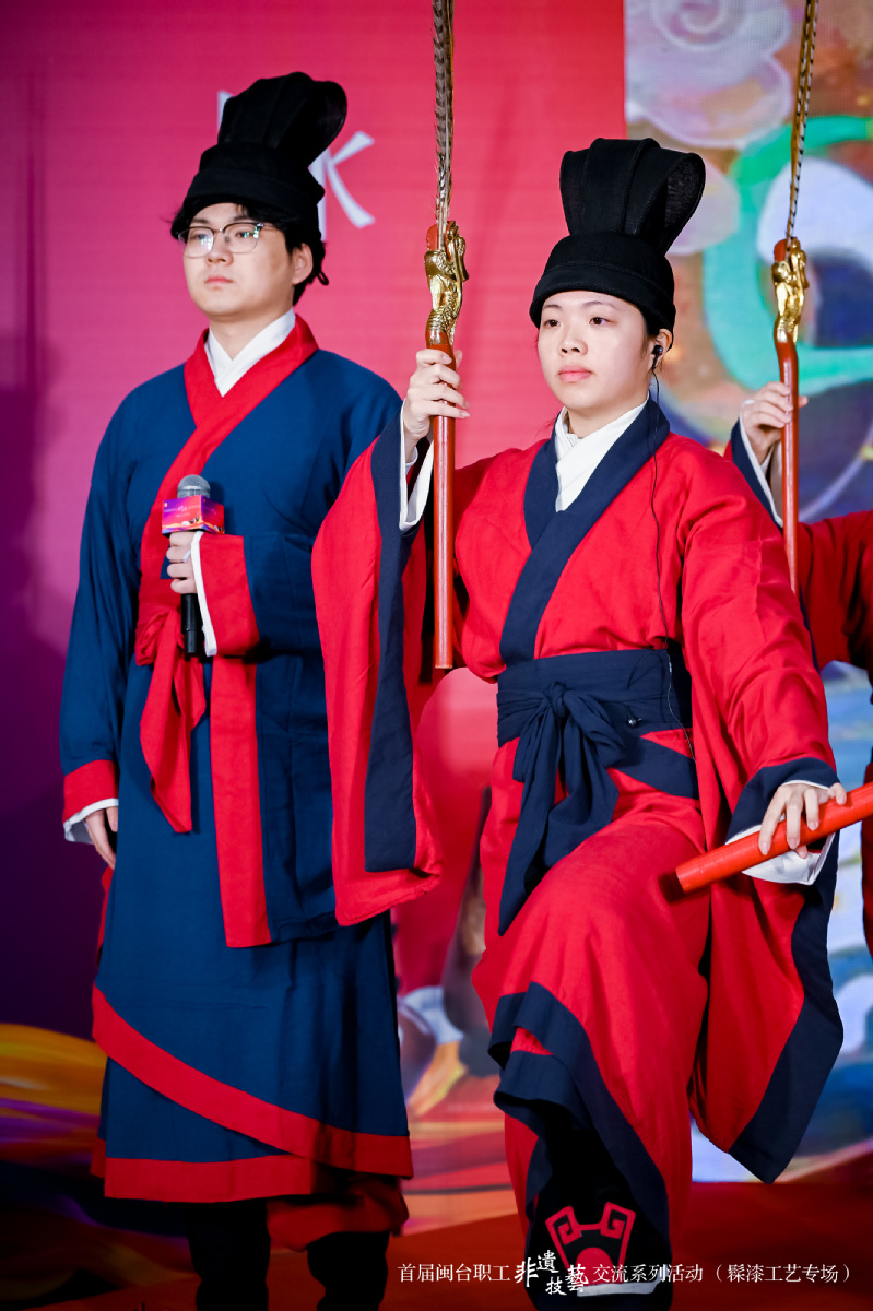 开幕式上,威廉希尔体育佾舞传承中心18名佾生在活动中进行非遗文化-佾舞展演,展现佾舞迎客之大礼。闽台漆艺大师、专家学者、职工代表、师生代表200余名共同观看。