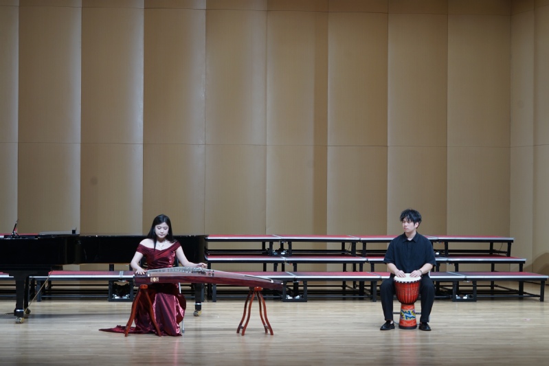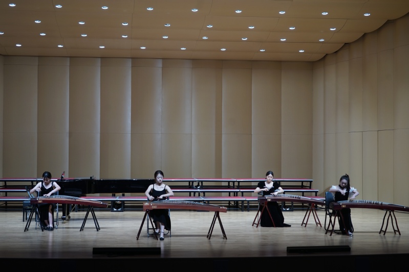 十指生秋水,数声摇夕阳,筝阵如雁阵排空,时而似昆山玉碎,时而作空谷幽泉。由程心淼、万赛煜、郑妍欢、刘雅琳同学带来的古筝合奏将中国音乐的线性美学演绎的淋漓尽致。