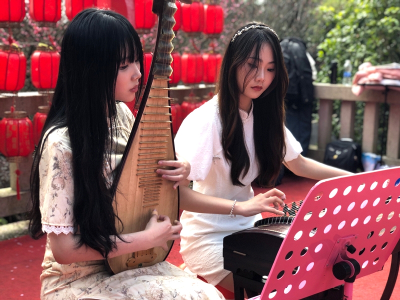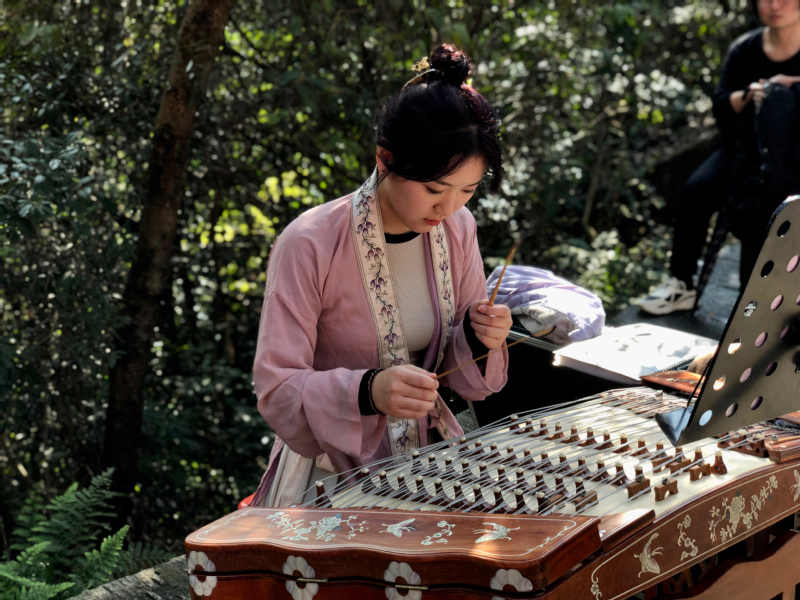 由音乐公司的张婧琪、陈林娟、林心琬、欧阳一心和邵雯组成的乐器表演小分队,分别在景区入口、相怀梅园、古泉跌水、岩梅古台四处设点,为游客带来了扬琴、古筝、琵琶和竹笛演奏,为游客们带来了《兰亭序》、《清明雨上》、《春到湘江》、《海峡音诗》等古典曲目的演奏。琴声、笛声悠长,与山间鸟鸣遥相应和,合奏着林间交响曲,吸引了众多游客一一驻足停留欣赏并纷纷拿出手机拍照、录像、合影。