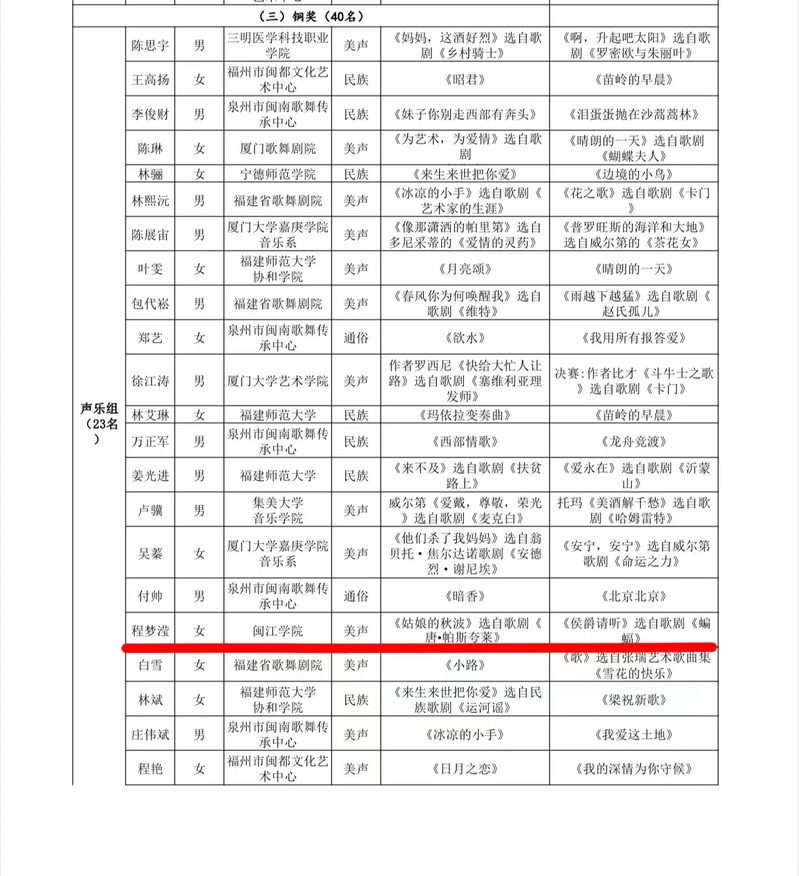 近日,由福建省文化和旅游厅主办、福州市文化和旅游局承办的第十一届福建省中青年演员比赛落下帷幕。音乐公司2019级本科生程梦滢作为公司唯一进入决赛的选手,在决赛中演唱《姑娘的秋波》和《侯爵请听》,荣获声乐舞蹈杂技类声乐组铜奖。